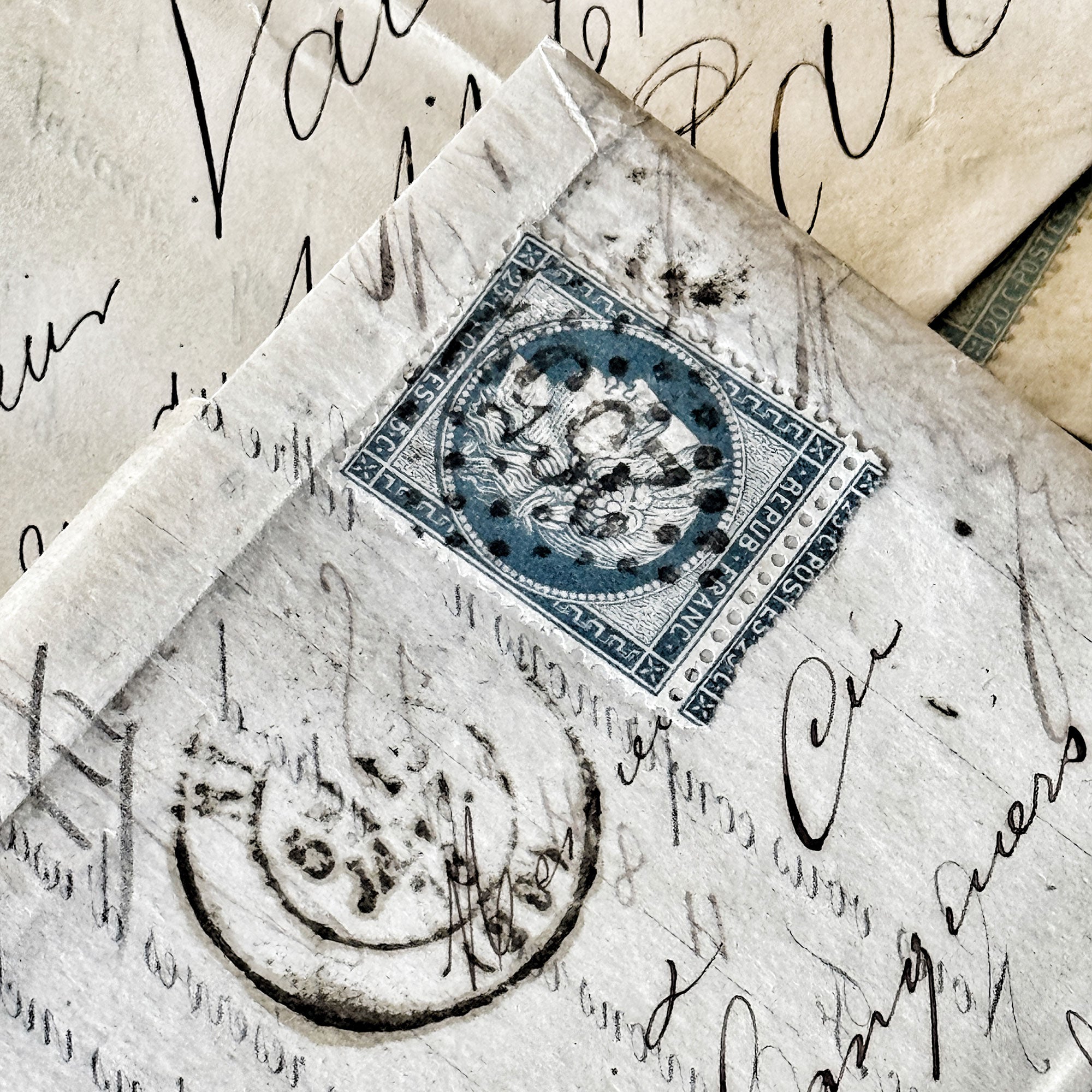 Authentic handwritten French letters dating from the 1850s, featuring original postage stamps and postal markings. These pieces offer a glimpse into everyday life and correspondence of the 19th century, with elegant ink cursive writing.