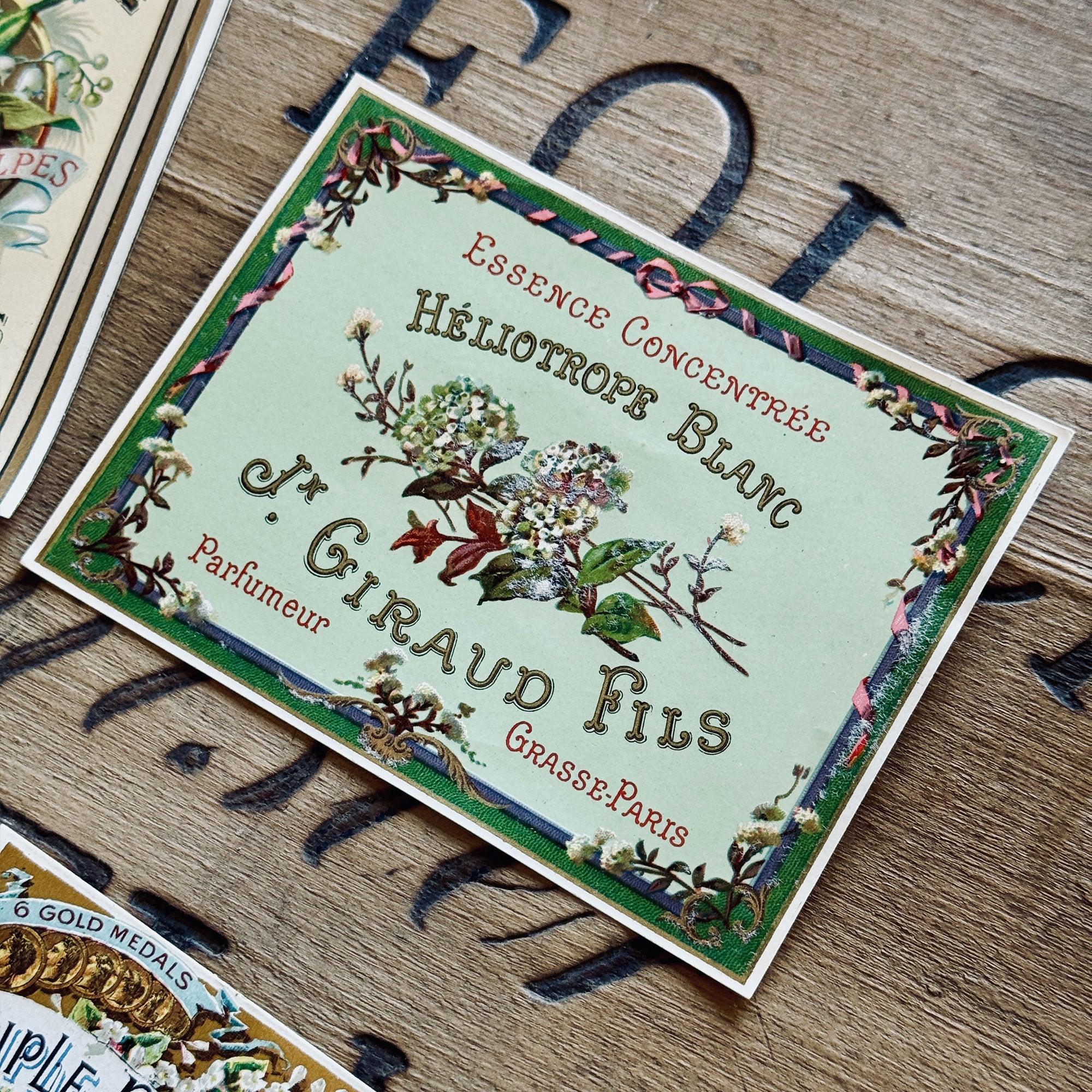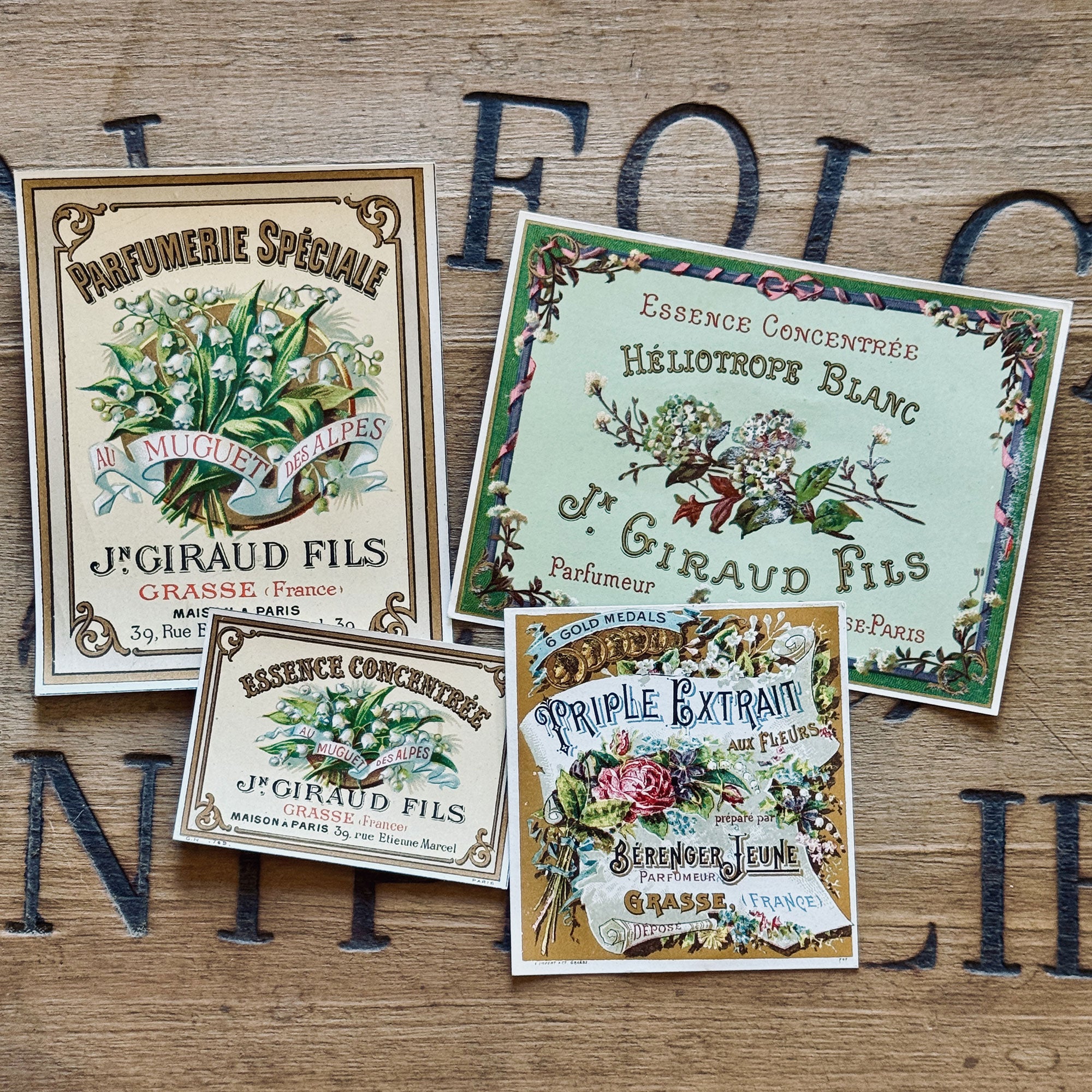 A selection of original French perfume labels from the late 1800s, including pieces from historic houses such as Giraud Fils, a perfumery based in Grasse—long regarded as the heart of French fragrance production.